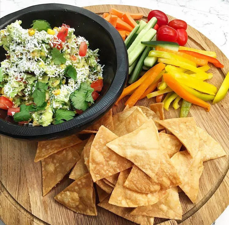 - Half, seed and scoop flesh from avocados into a large bowl. Add garlic puree and lime juice. Mash slightly, still leaving it chunky. Fold in onion, jalapeno, tomato, roasted poblano pepper, half the charred corn, and cilantro. Season with salt to taste and garnish with remaining corn, cotija cheese and whole cilantro leaves.